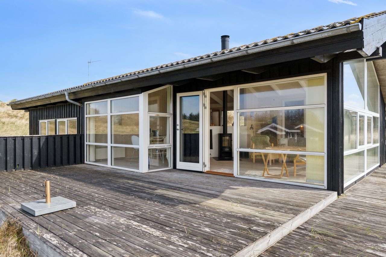 Gedigent, flot og velholdt fritidshus opført i sortmalet træværk, betontagsten, sorte udhæng og hvide vinduer.