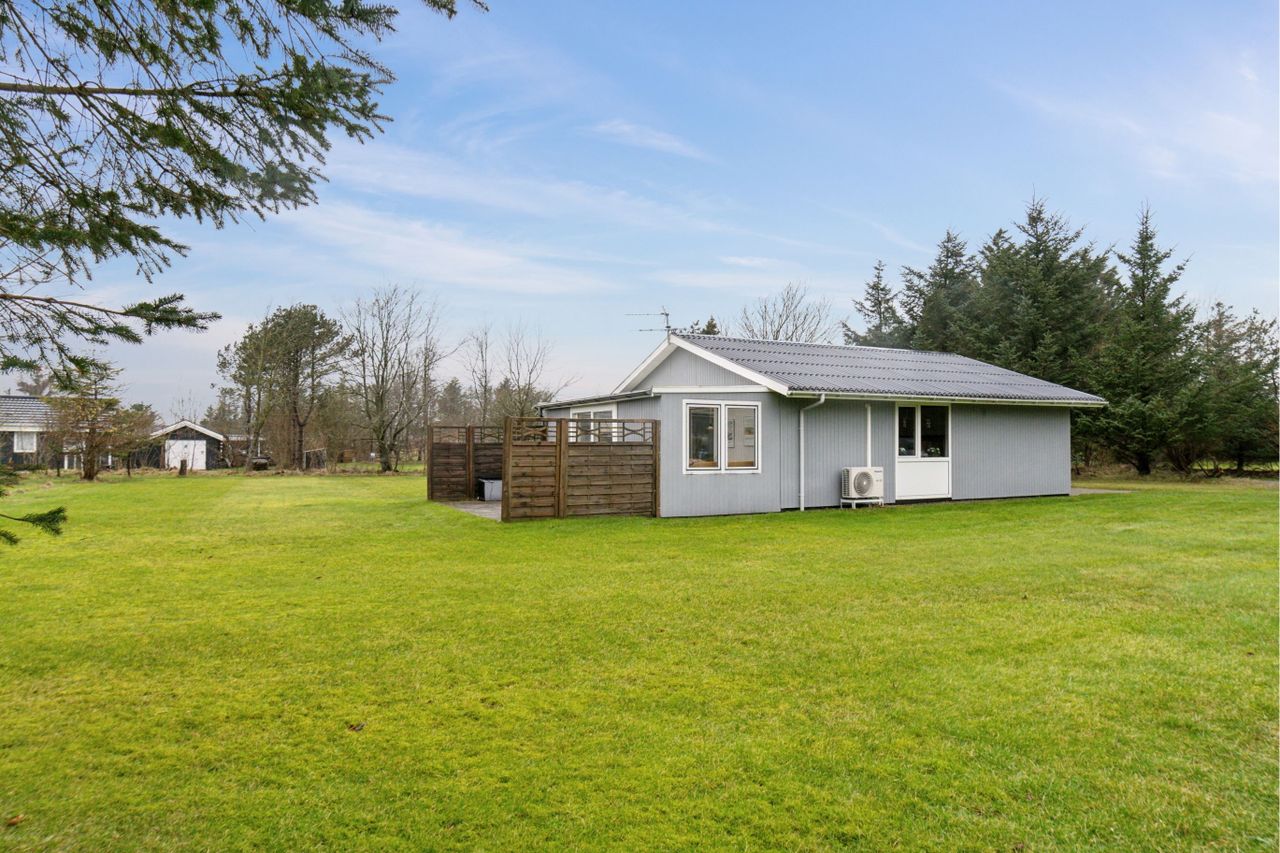 ud på terrassen. Der er vægge og lofter i lys fyrrustik og helt lyse laminatgulve. Køkkenet indeholder alle