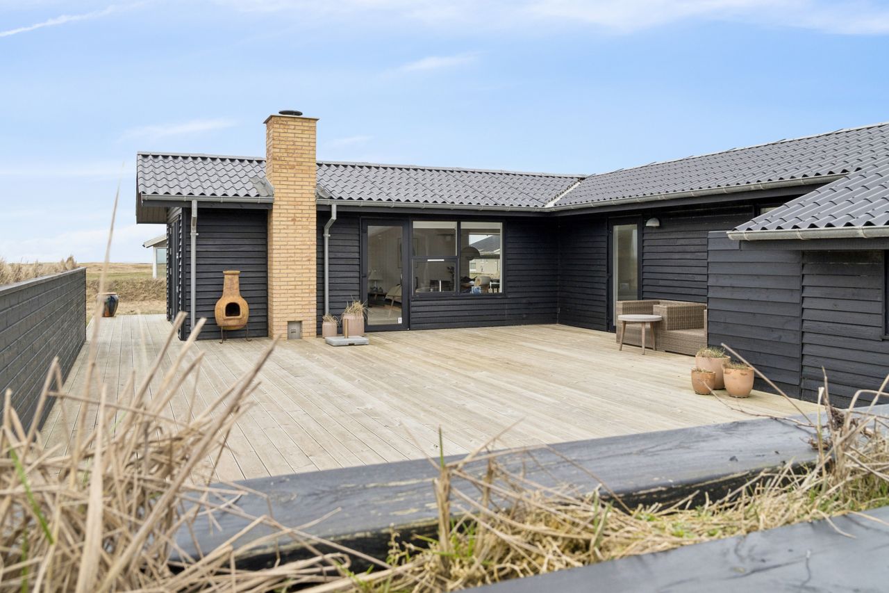 Sommerhuset er sort med sorte taginddækninger, døre og vinduer. Der er nye vinduer og døre samt nyt tag fra 2021.