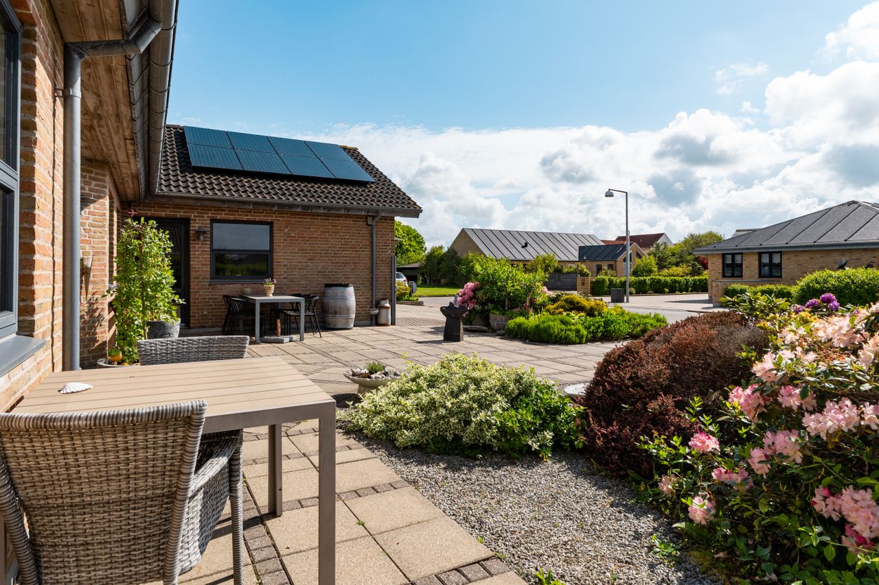 Grunden er mod vejen udlagt med fliseindkørsel og flotte nemme bede som skaber både rum og hygge. På den anden side af huset er haven udlagt med nem græsplæne hvor robotten klarer græsklipning. Så man hver dag kan nyde den flotte grønne plæne. Derudover stakit og hæk til alle sider. Huset ligger på en blind vej, så der er ikke trafik til andre end de otte huse på vejen.