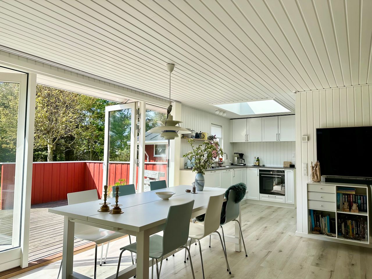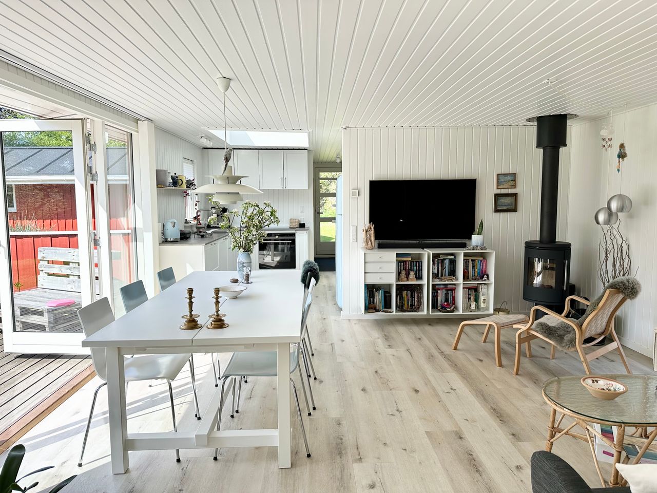 Det store lyse køkkenalrum indbyder til familie hygge rundt om det store spisebord, mens der bliver lavet mad i det lækre køkken med kig til himlen gennem det store ovenlysvindue. Efter maden kan man slappe af i de bløde møbler foran fjernsynet eller tænde op i brændeovnen og nyde flammernes gnistren.