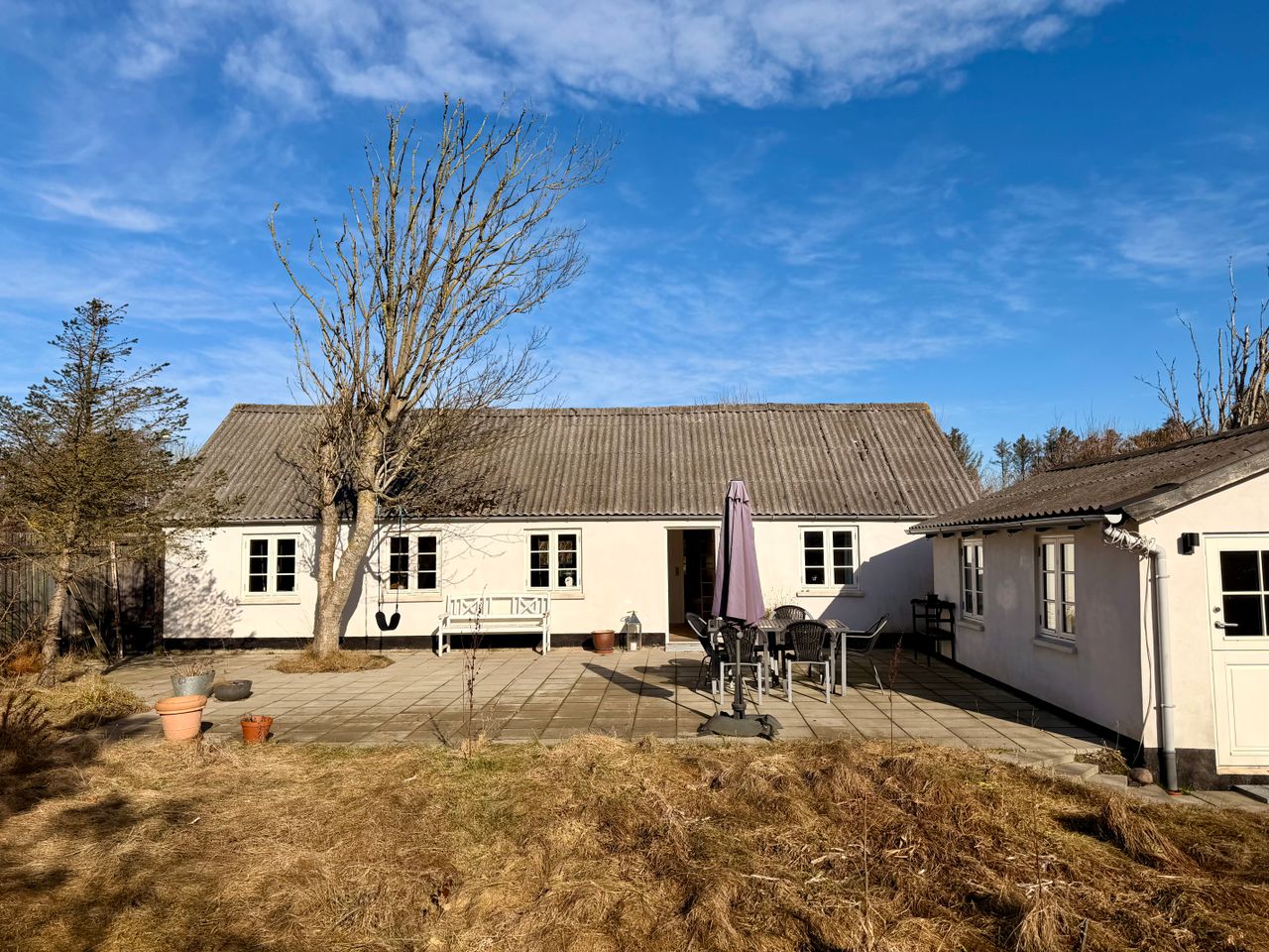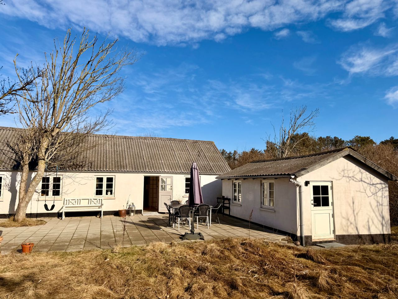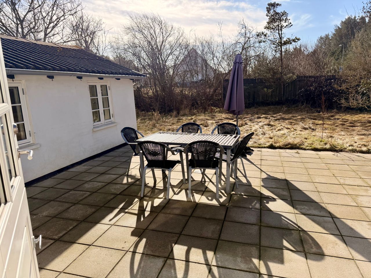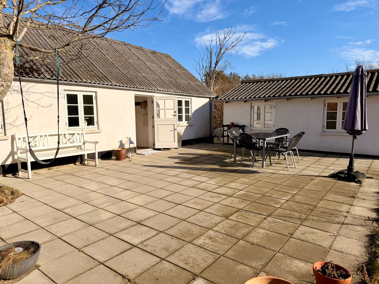 Stor terrasse mod syd og som leder hen til bygning 2. Denne er registreret som anneks og indrettet med et værelse i hver sin ende og med hver sin hoveddør. Væggen imellem, kan åbnes op hvis det passer bedre til sit behov.