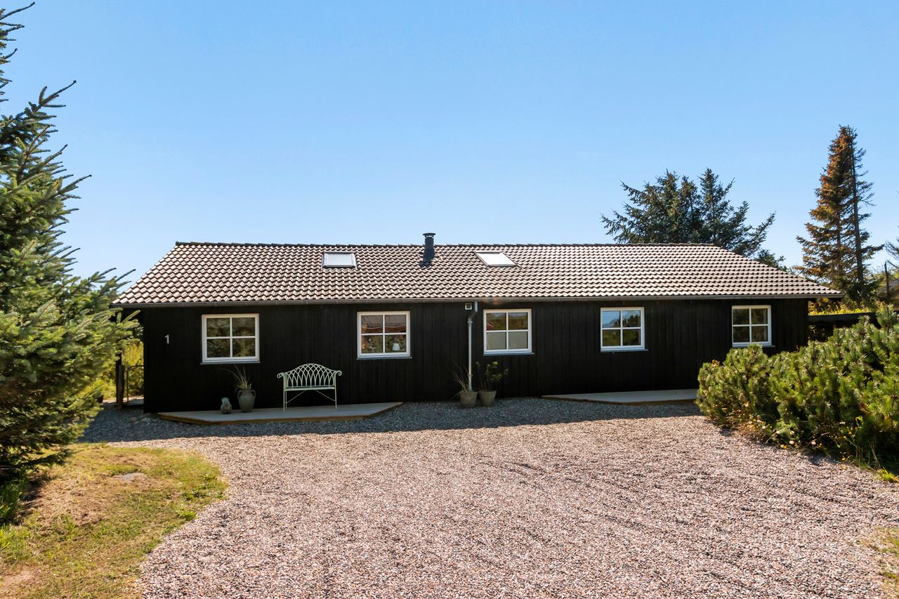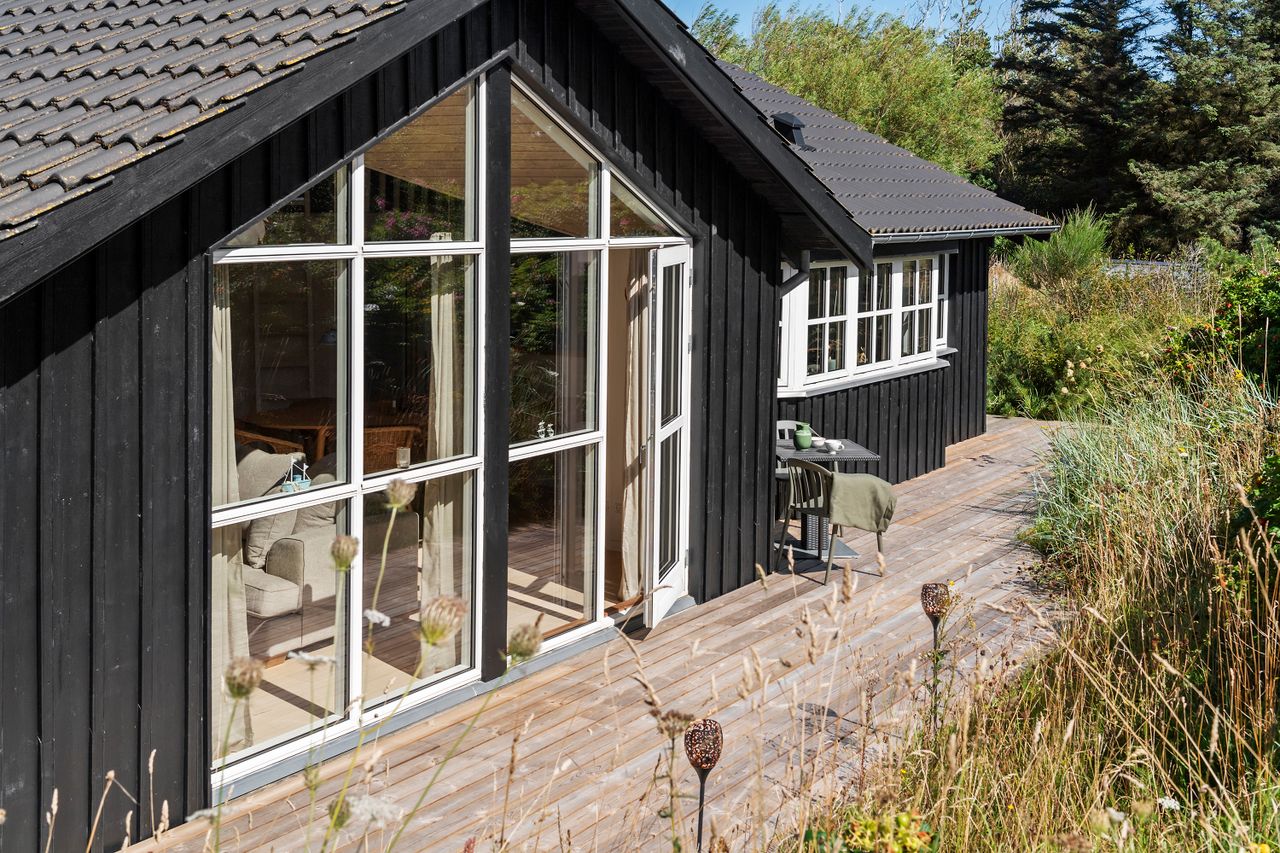 Sommerhuset, der er fra 2008, er opført i sortmalet træ med hvide døre og vinduer.