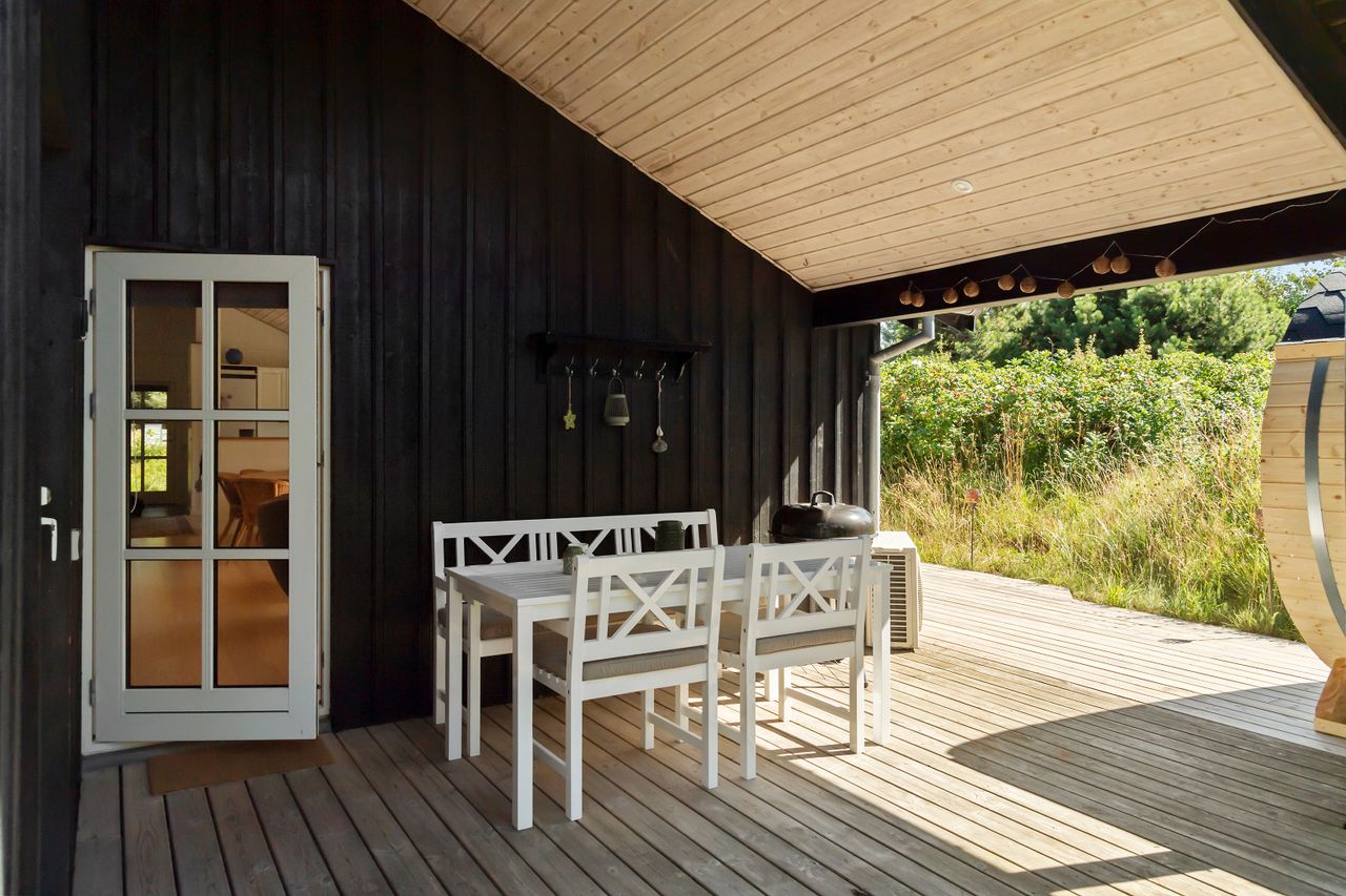 Der er terrasse på alle fire sider. Terrassen mod syd/vest er overdækket og her er der opsat en saunatønde.