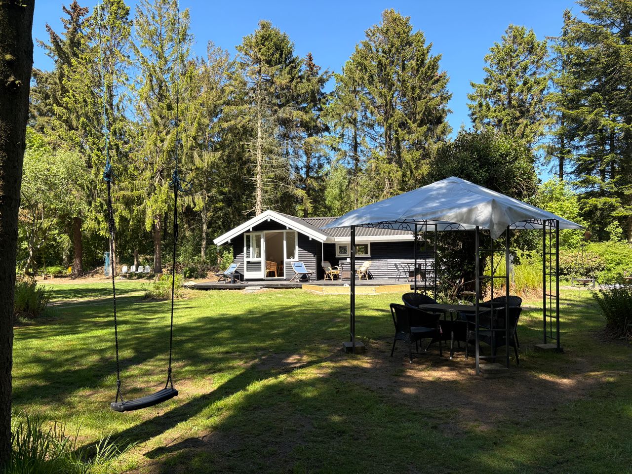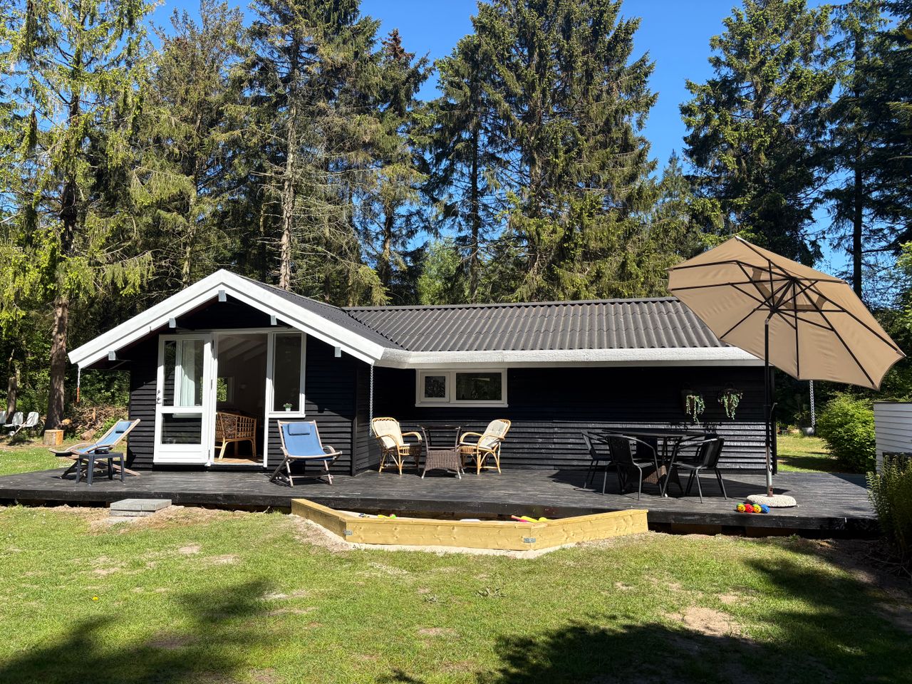 Charmerende helt opdateret hus med stort køkken-alrum, stort soveværelse med dobbeltseng, badeværelse med brus og bidet, entre og overdækket indgangsparti og kæmpe syd- og vestvendt terrasse. Her er baby pool, gril, gynge, klatrenet, stor sandkasse og ulvesti. Stor fodboldbane med net mål.