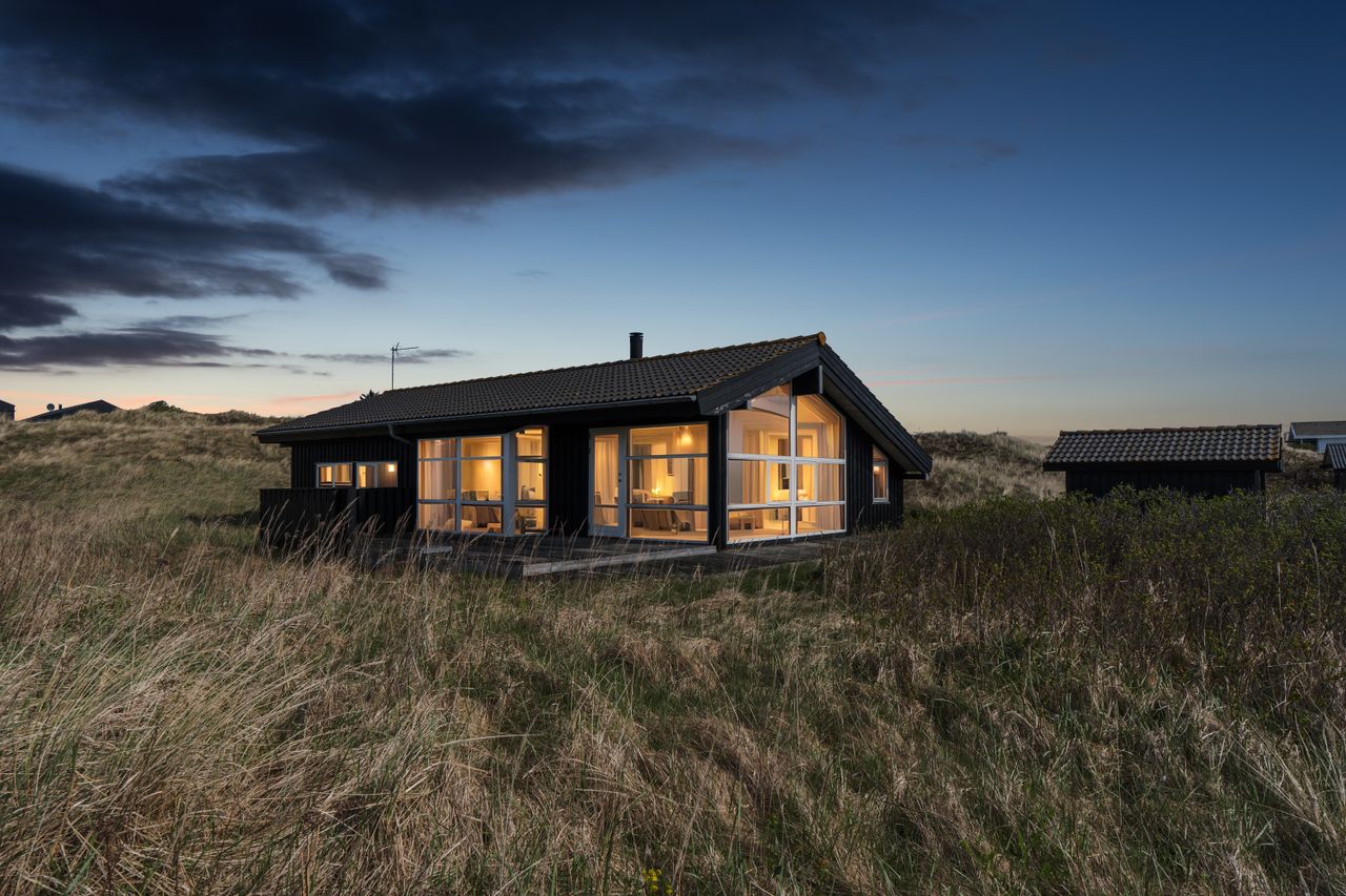 Gedigent, flot og velholdt fritidshus opført i sortmalet træværk, betontagsten, sorte udhæng og hvide vinduer.