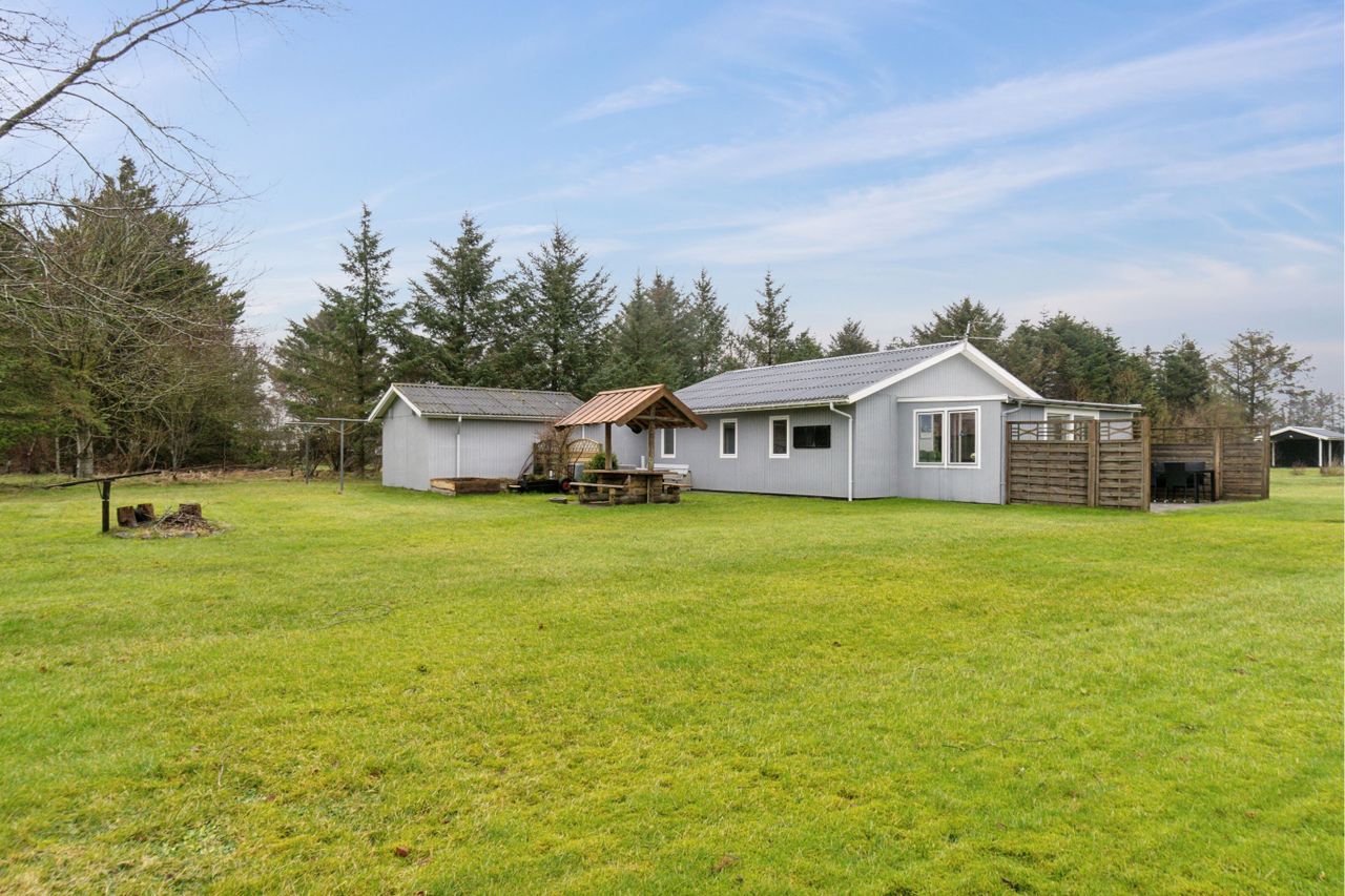 ud på terrassen. Der er vægge og lofter i lys fyrrustik og helt lyse laminatgulve. Køkkenet indeholder alle