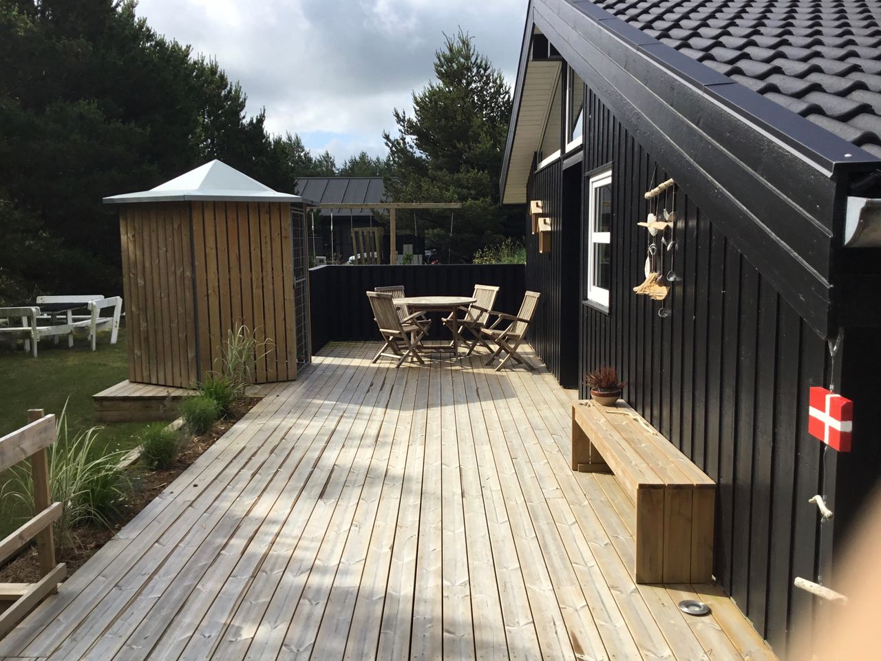 brændeskur og mange flere lækroge. Huset er sortmalet med hvide vinduer og underdæk.