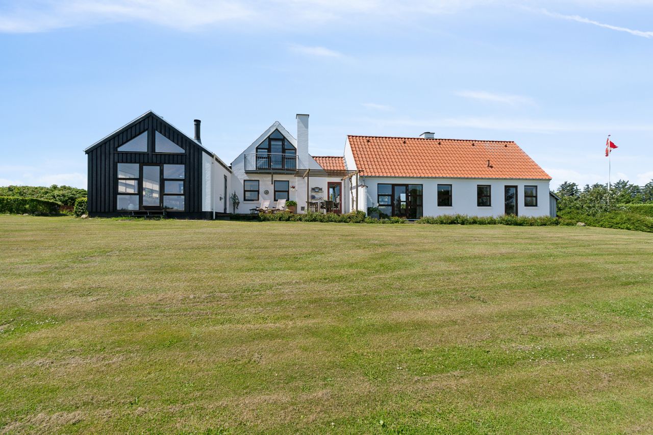 Det løbende renoverede stuehus er bygget i vinkel med en gang til at forbinde de to fløje. Den ene fløj rummer husets store opholdsstue med brændeovn samt stort soveværelse og badeværelse. Den anden fløj indeholder køkken/alrum - med endnu en brændeovn, en stor udestue på 28 m2, der ikke tæller med i beboelseskvadratmeterne, entré/bryggers, bad samt to værelser, hvor det ene anvendes som kontor. Herfra kan man komme man op ovenpå, hvor der er et stort værelse/kontor, en repos med trappe op fra entréen samt endnu et værelse, hvor der er balkon med den flotteste udsigt ud over området.
