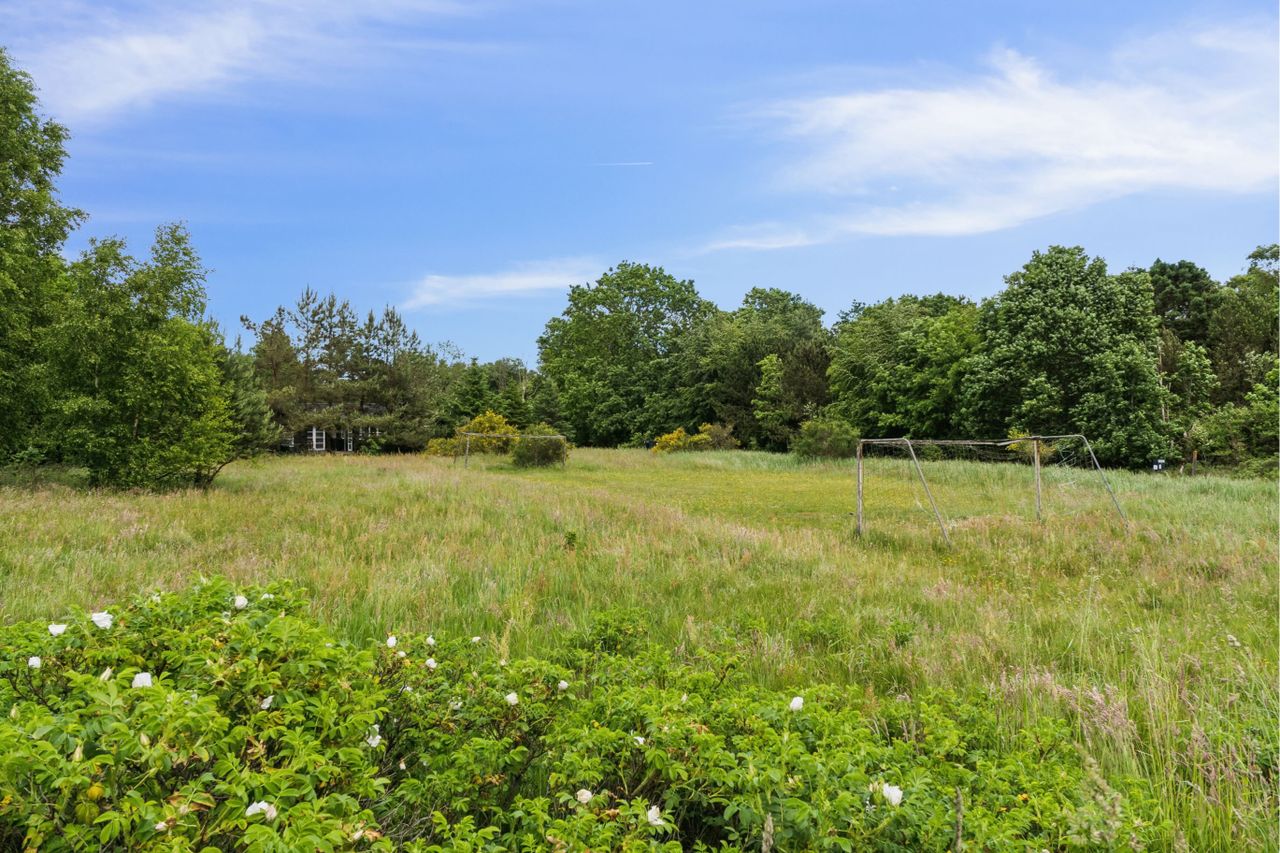 der er slået græs til en boldbane, hvor børnene på vejen har nemt ved at finde sammen til en