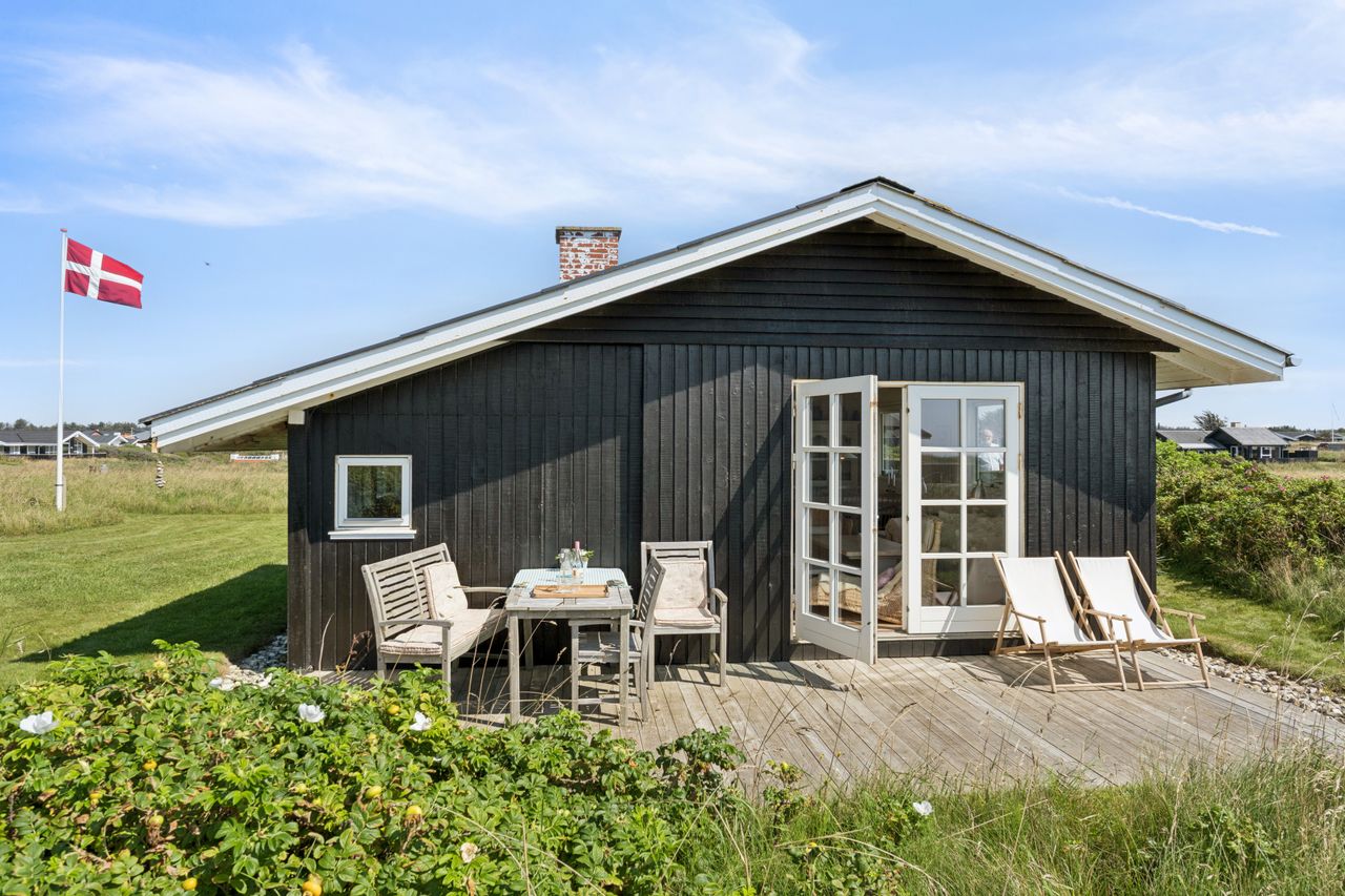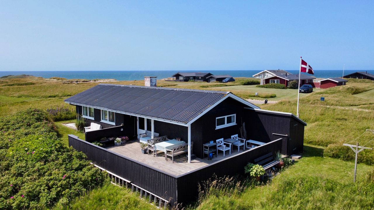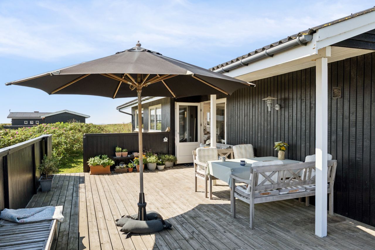 Der er udgang til terrasse mod syd, hvorfra der er udsigt til Rubjerg Knude Fyr, samt udgang mod vest hvorfra udsigten til Vesterhavet, med smukke solnedgange, er uovertruffen