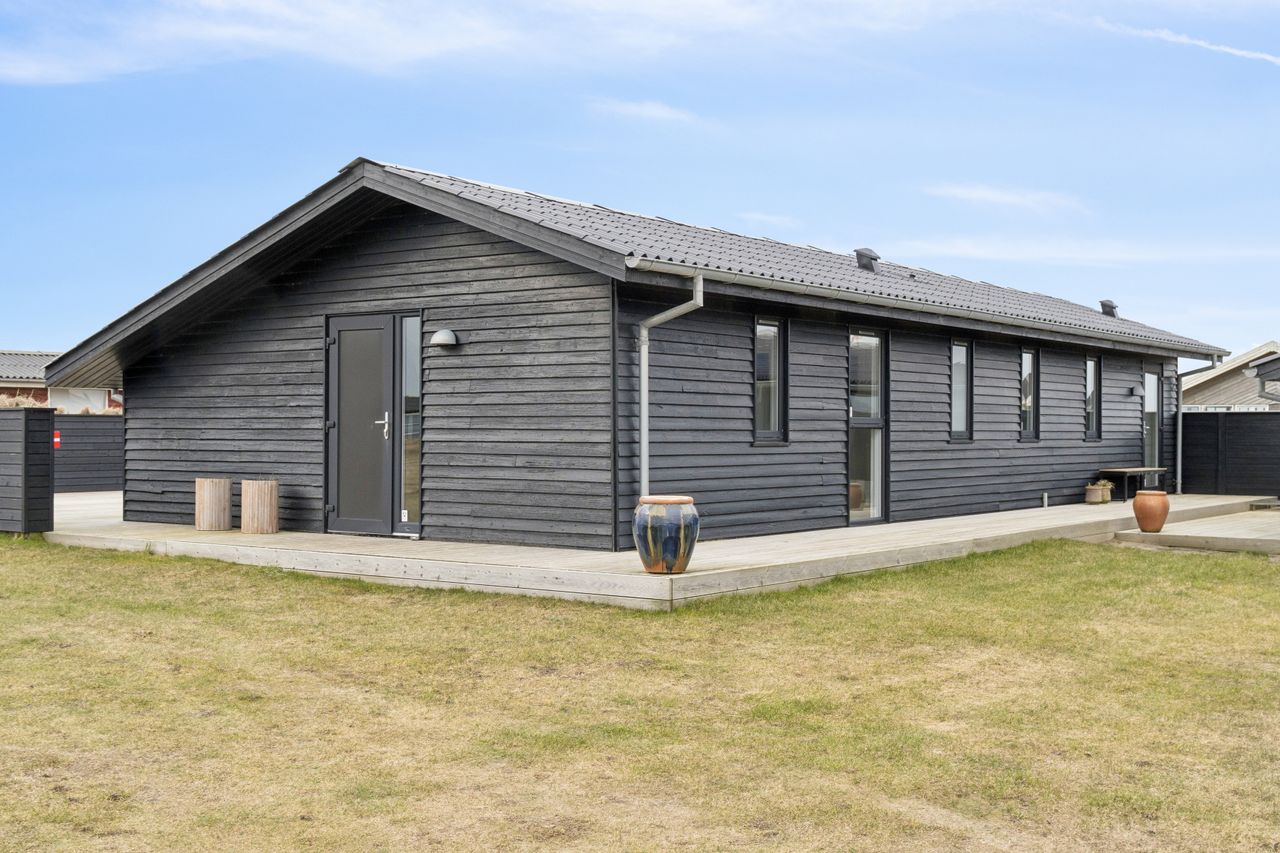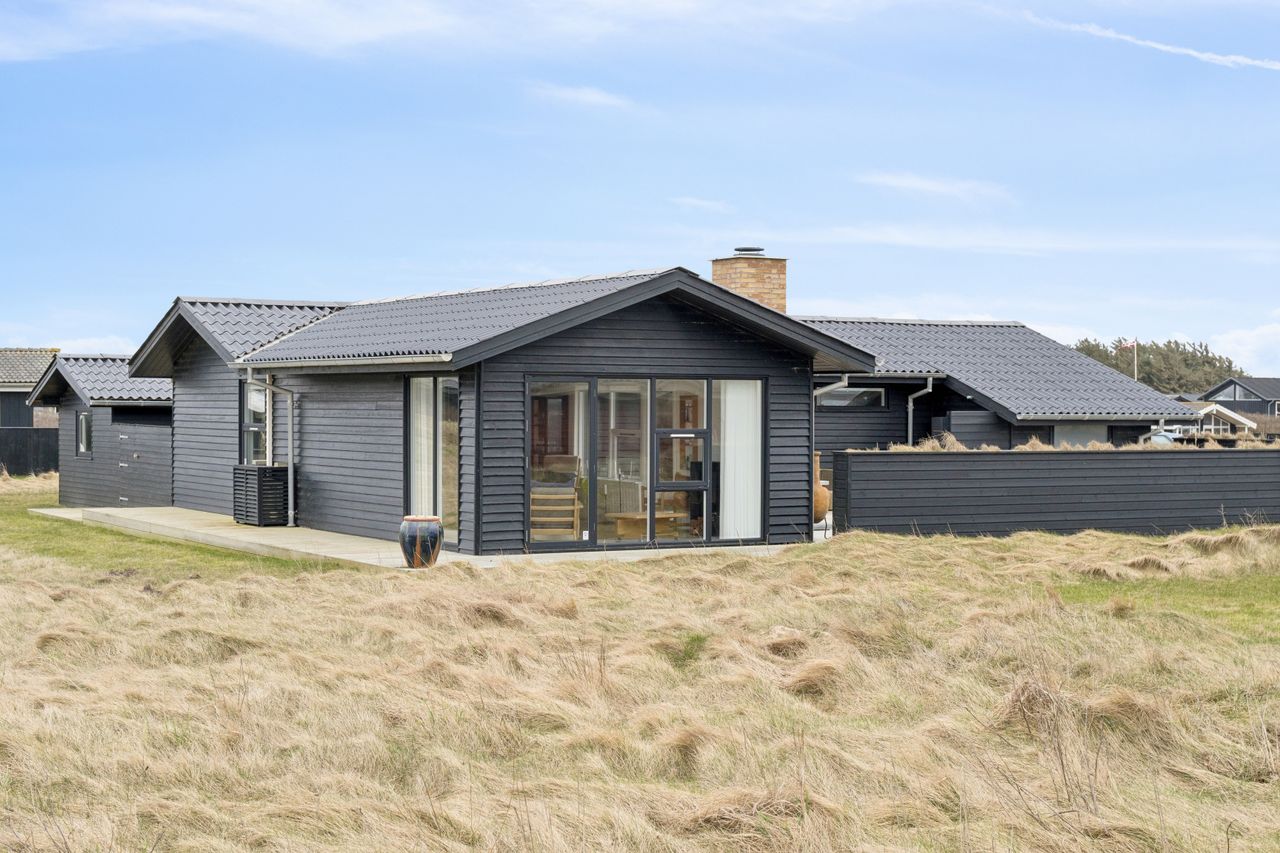 Sommerhuset er sort med sorte taginddækninger, døre og vinduer. Der er nye vinduer og døre samt nyt tag fra 2021.