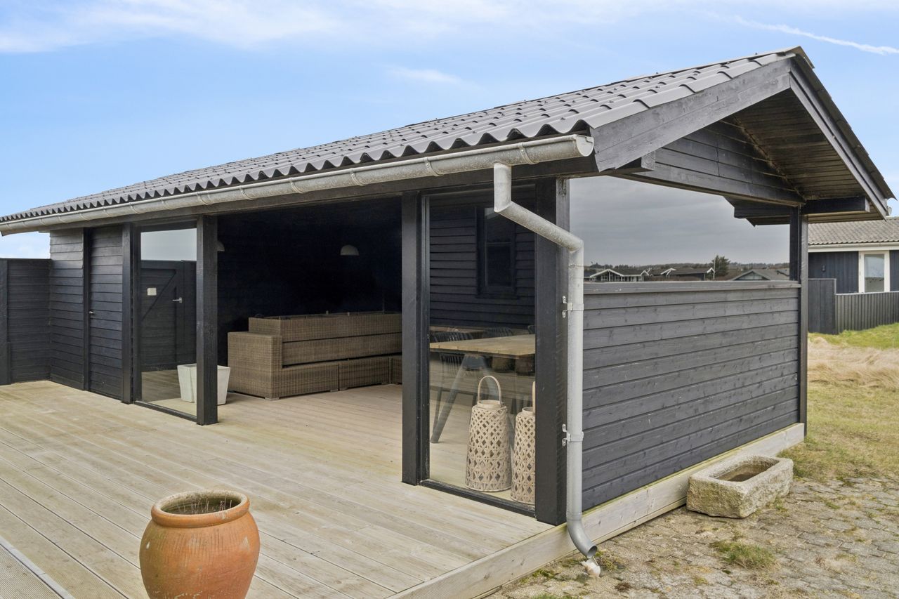 Der er en stor overdækket terrasse på 18 m2, der er lukket på tre sider. Redskabsrum på 8 m2 ligger i forlængelse heraf.