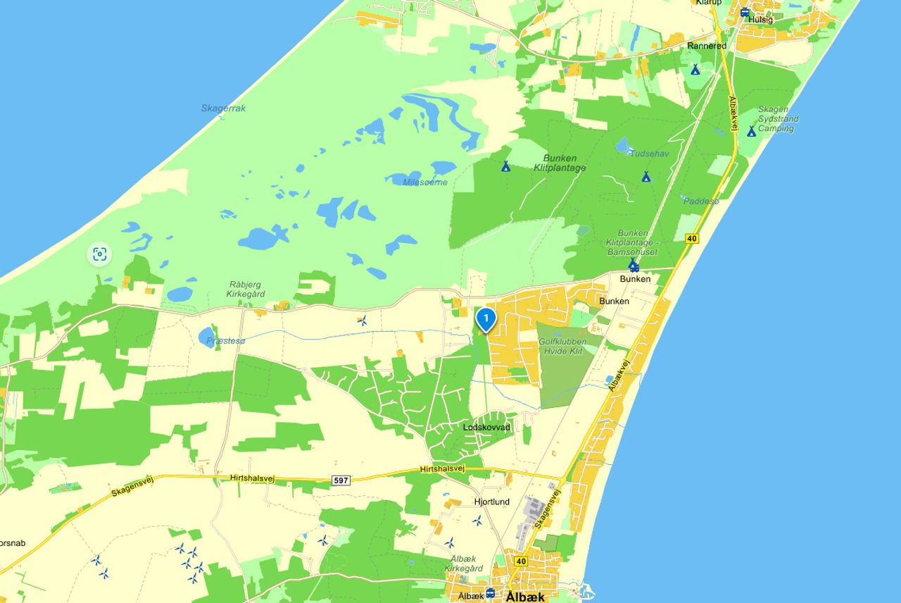 Bunken/Lodskovvad er et herligt feriehusområde mellem Skagerrak og Kattegat. Der er stier gennem området mod øst, som er den nærmeste adgang til vandet, nemlig ved Aalbæk Bugt. Der er et par kilometer til fods. Tager man cyklen ad landevejen er der lidt længere, men det går lidt hurtigere. Der er 15 km til Skagen og cirka det samme til Tversted. Frederikshavn ligger 20 km væk. Motorvej E45 nås syd for Frederikshavn i ca. 25 km's afstand.